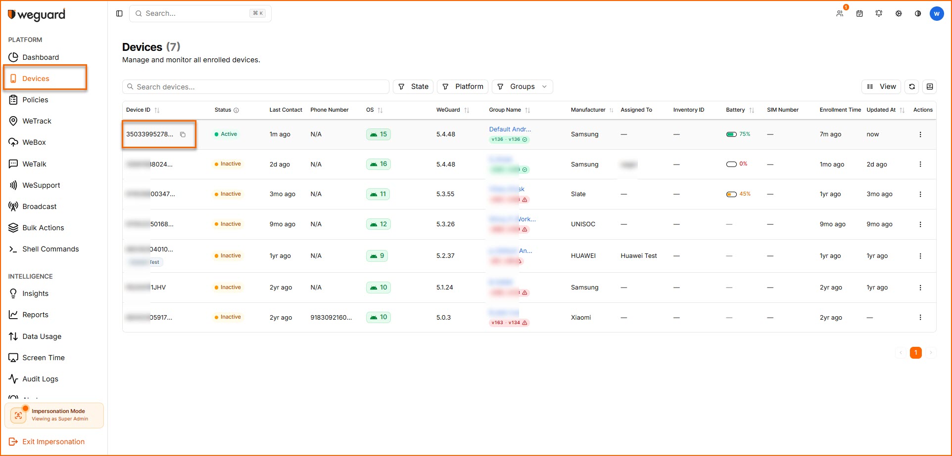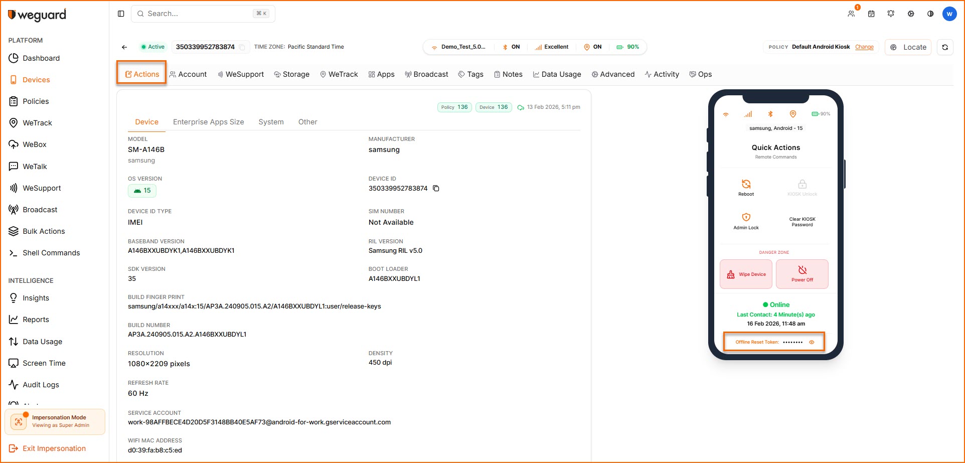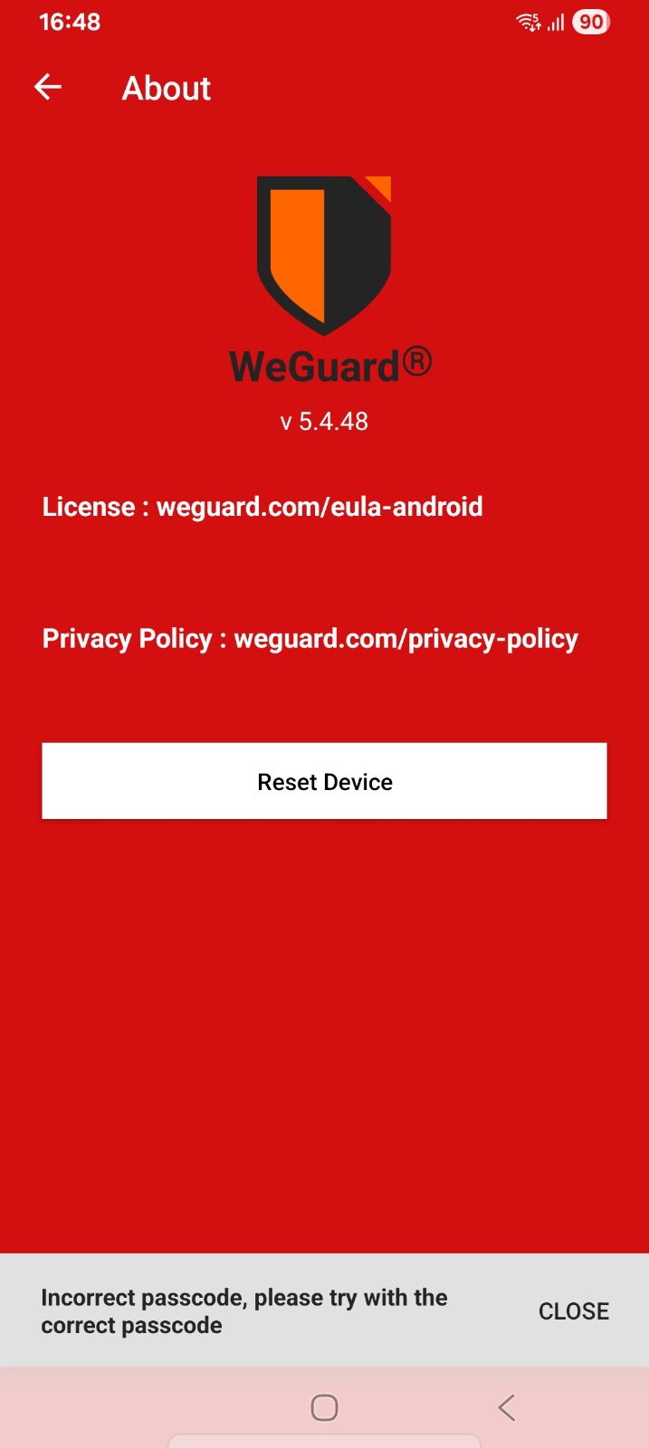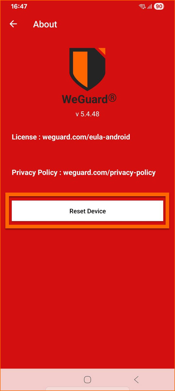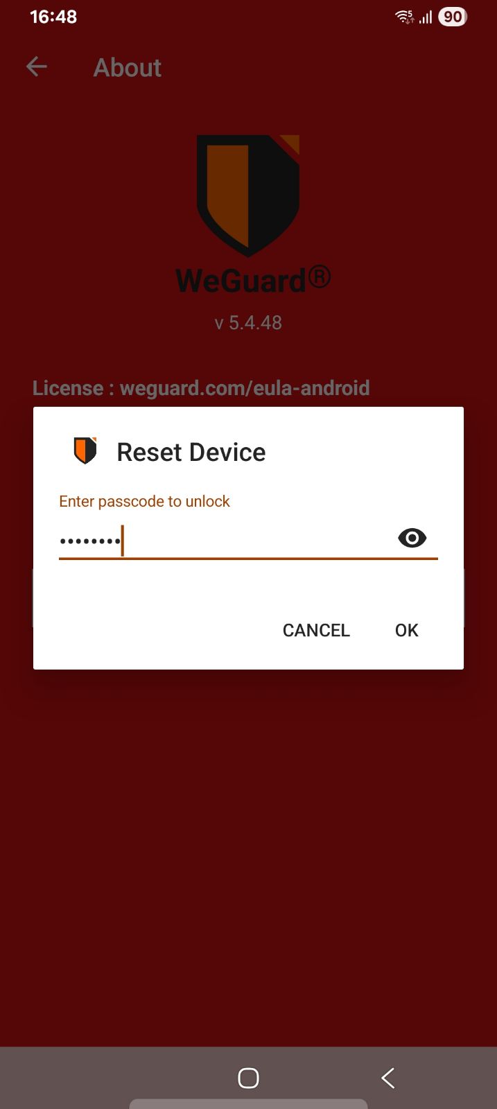 Each enrolled device is automatically assigned a unique reset token, which is available in the WeGuard Admin Portal. If a device must be reset while offline, the administrator can provide this token to an authorised user.