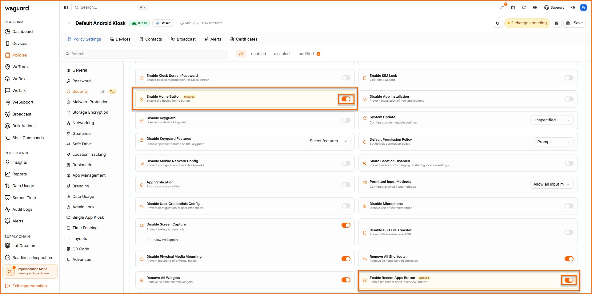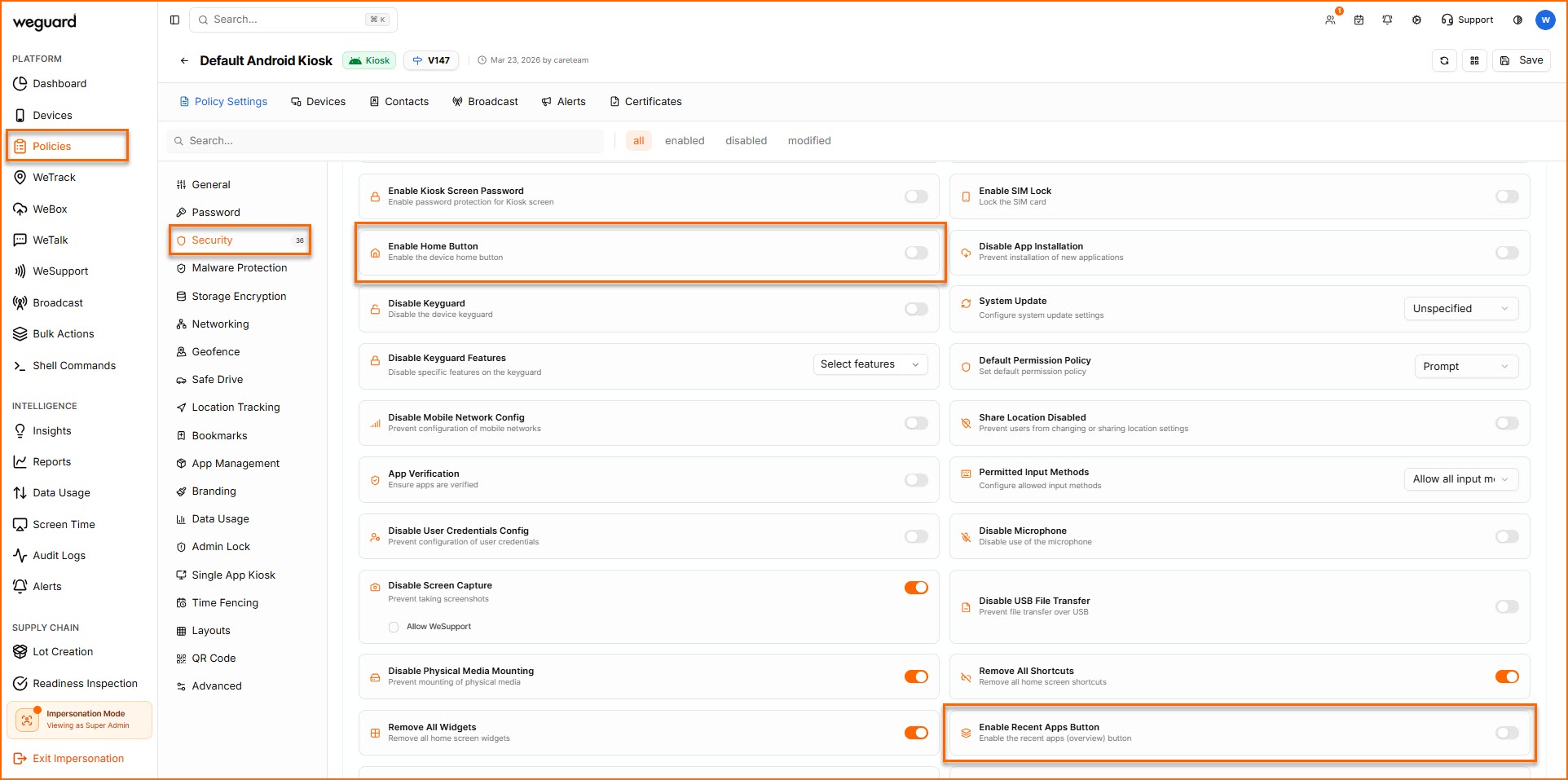 You can control access to the Home and Recent Apps buttons on Android devices using WeGuard MDM. Disabling these buttons helps restrict users from navigating away from allowed apps, ensuring better device control and security.