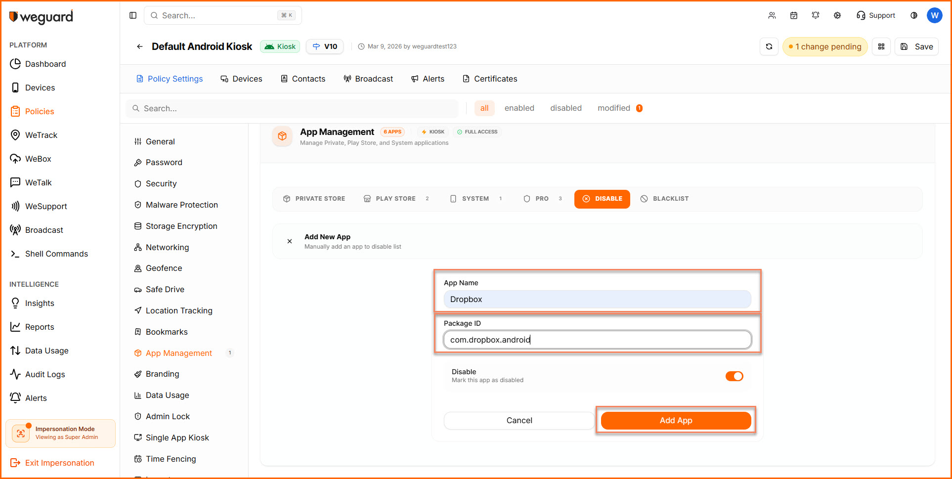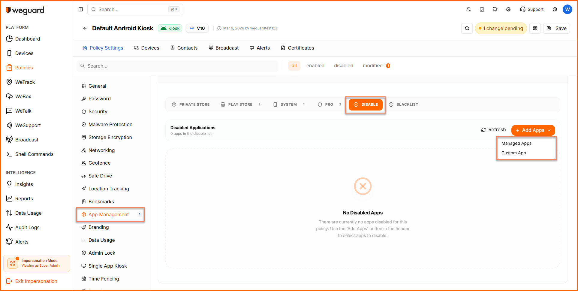 - Once you click on Save, you can see the custom app added to the disabled list. Click on Save to impose the policy on the devices.