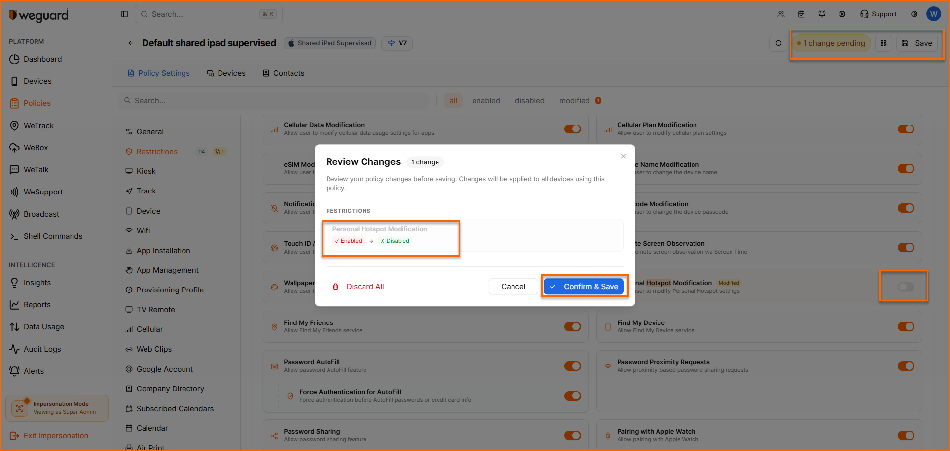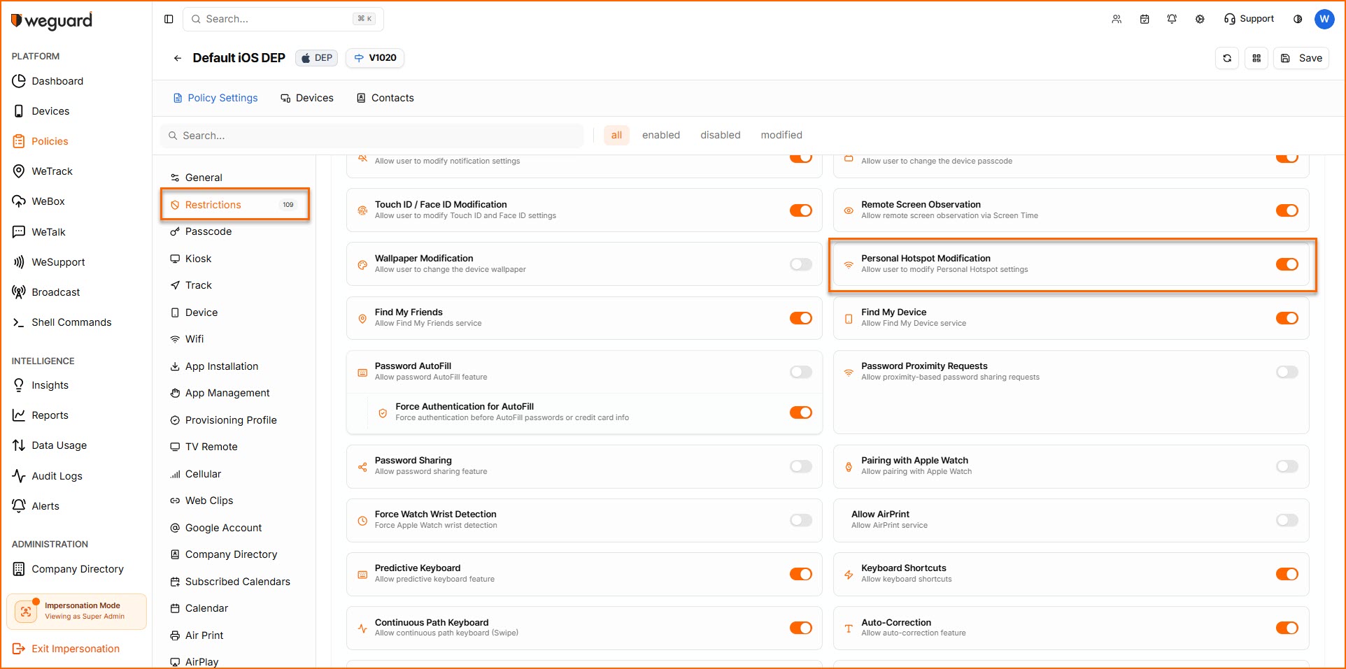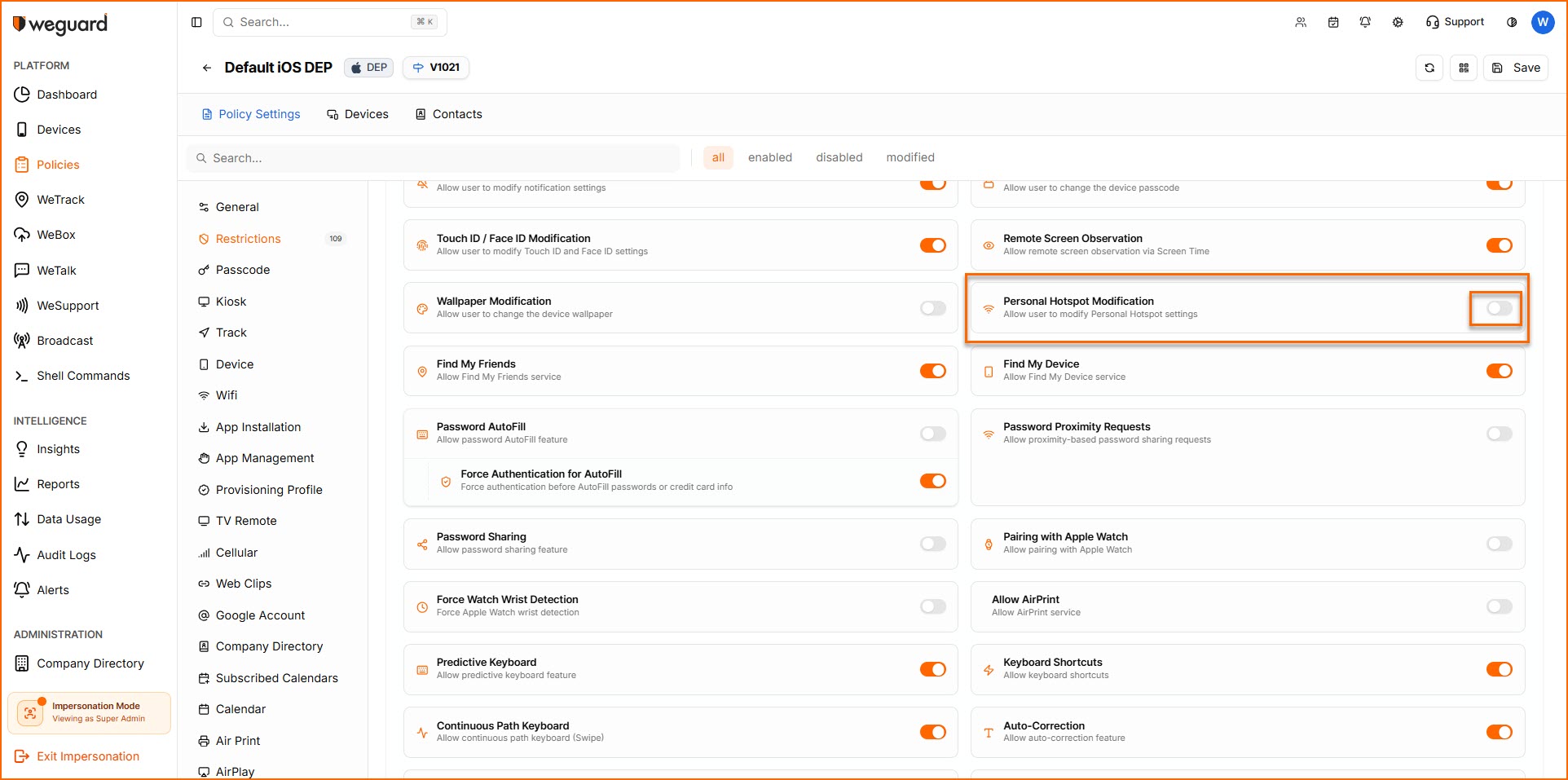 WeGuard MDM allows admins to enable or disable personal hotspot settings on the device remotely, with which they can permit or restrict users from sharing mobile data.