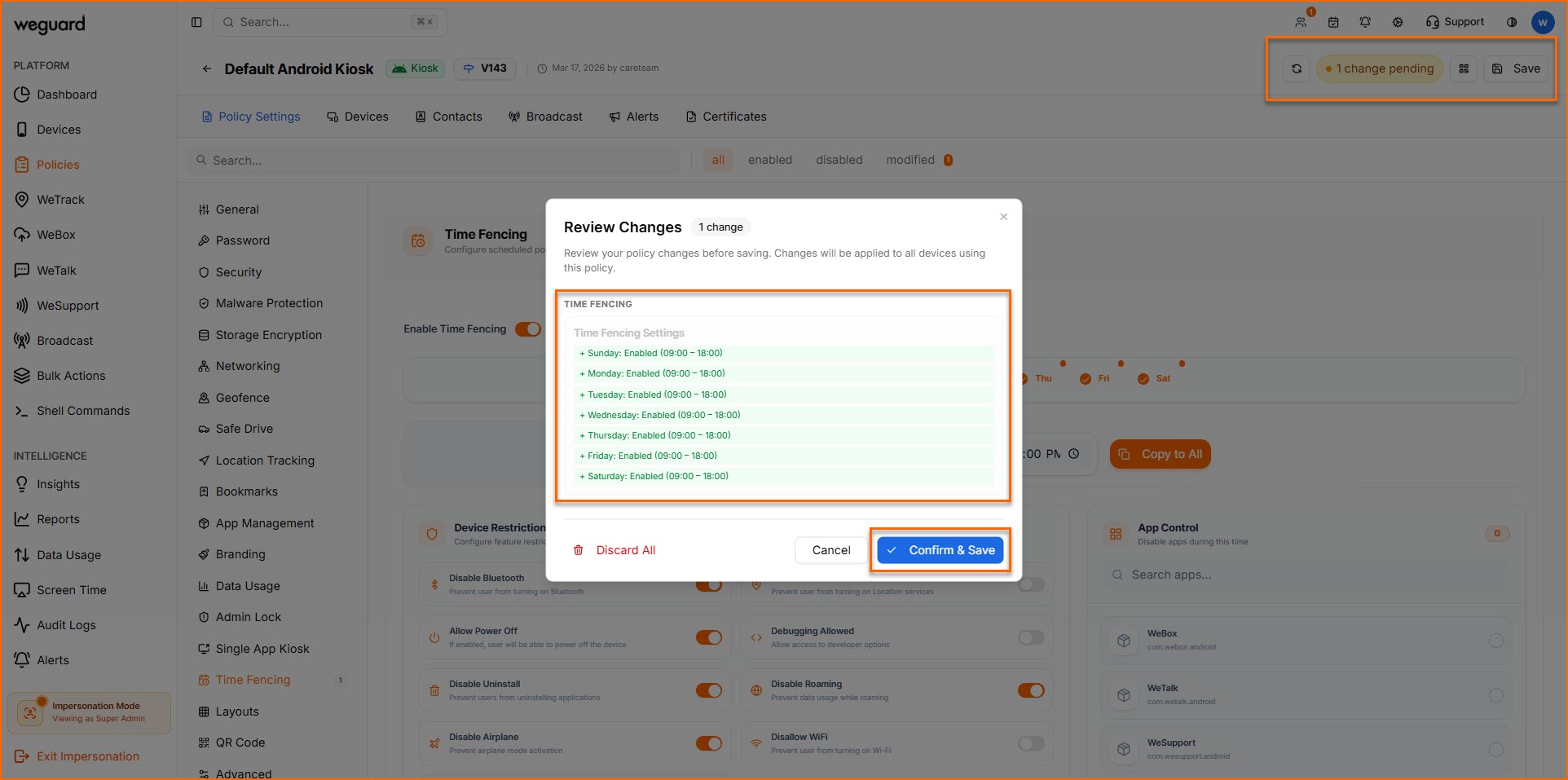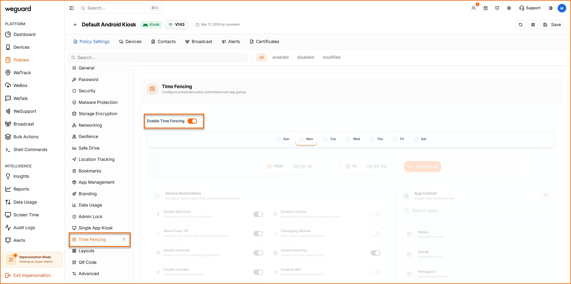 As and when devices are synced with the policy, WeGuard checks device time and applies the policy restrictions of Time Fencing.