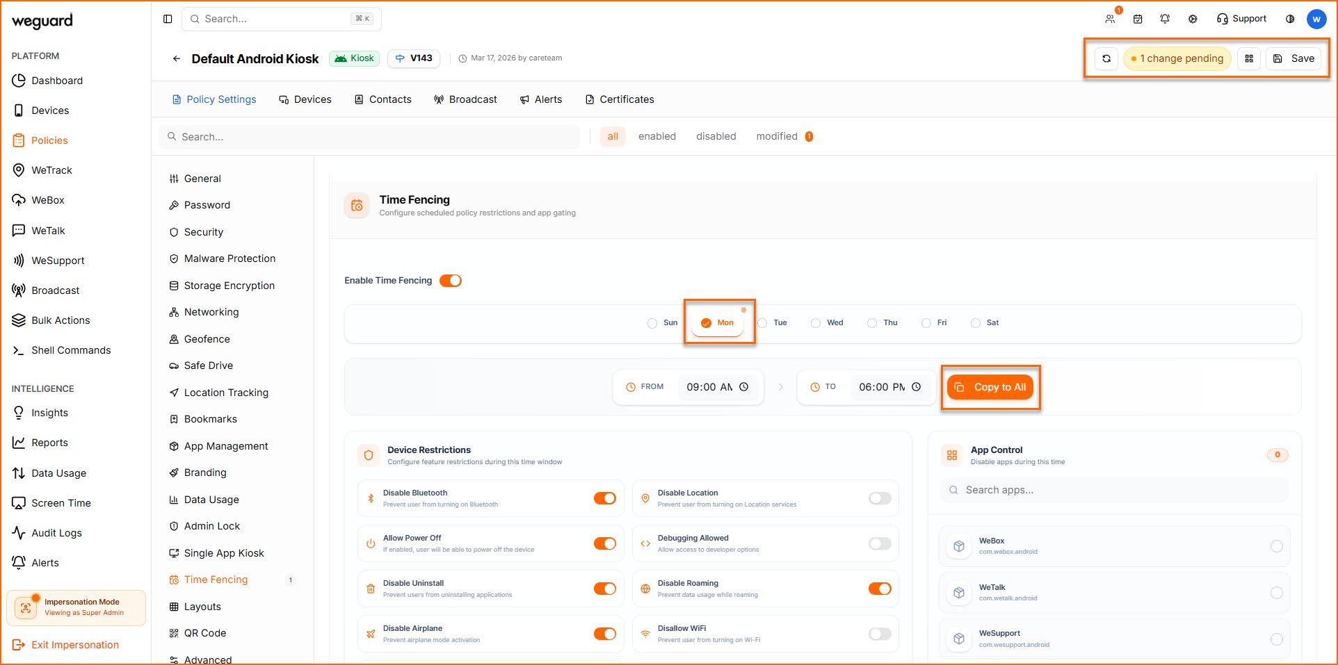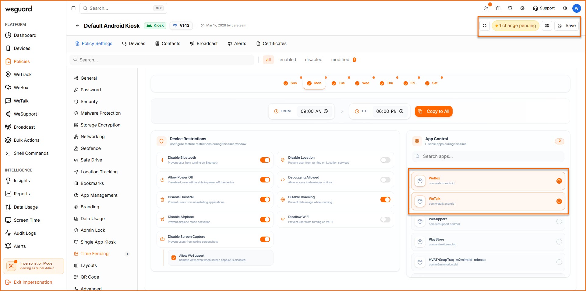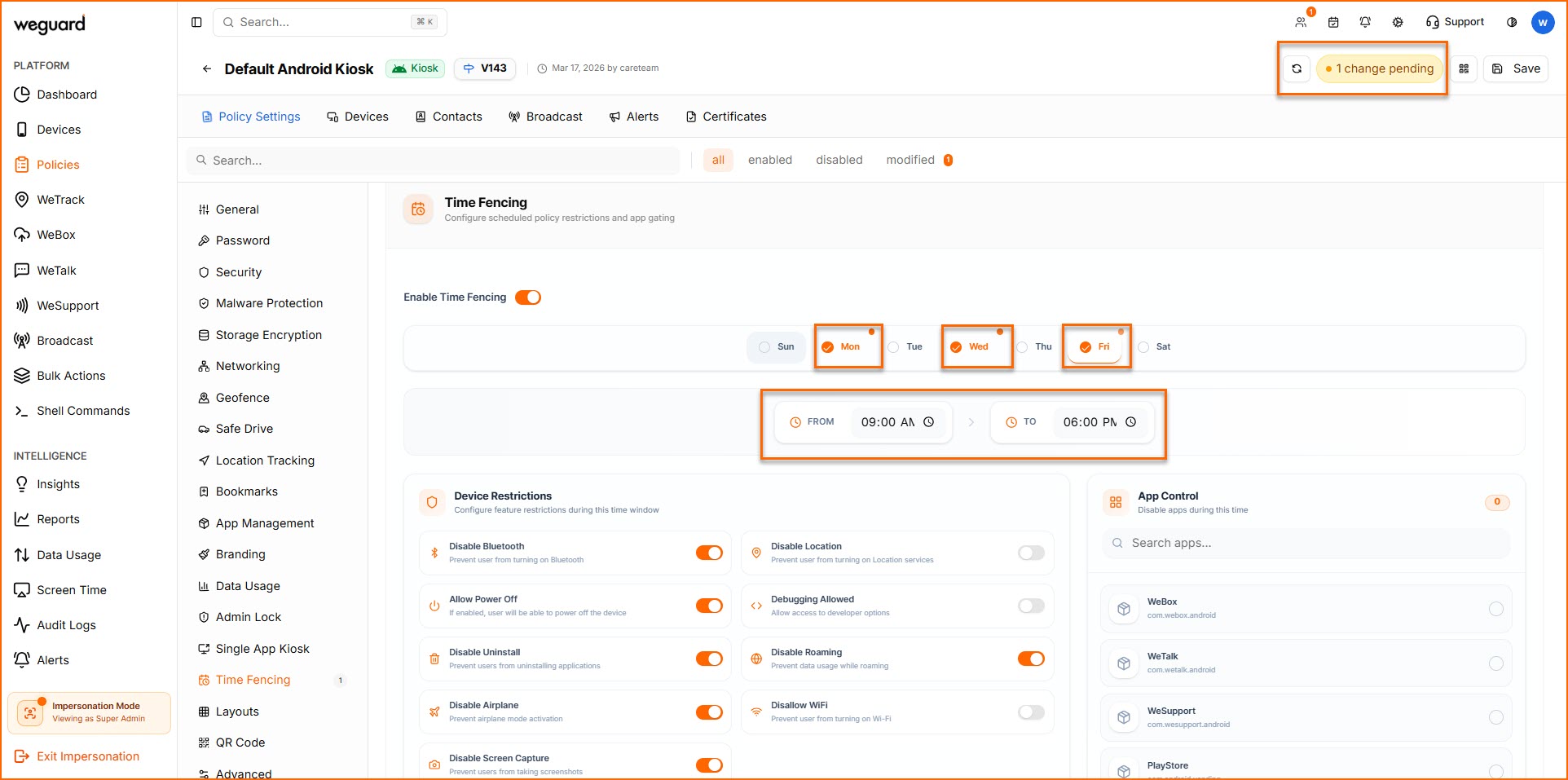 WeGuard’s Time Fencing feature enhances device security by controlling device access during designated time periods. It helps prevent unauthorized or unnecessary device usage while ensuring that sensitive information remains protected.