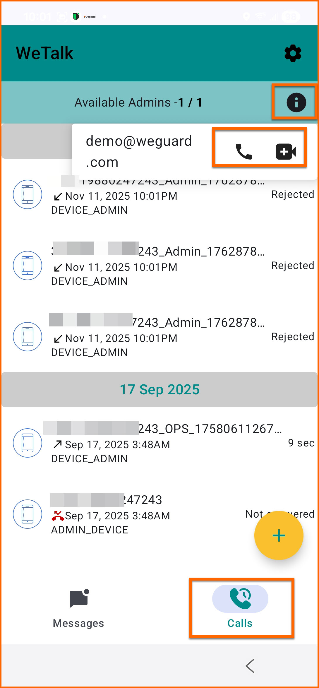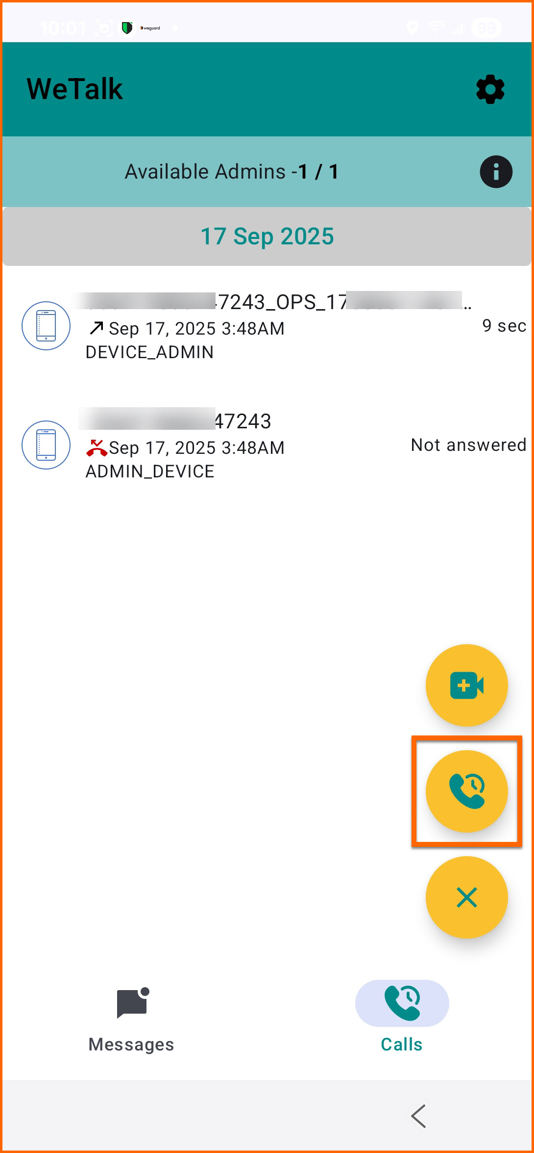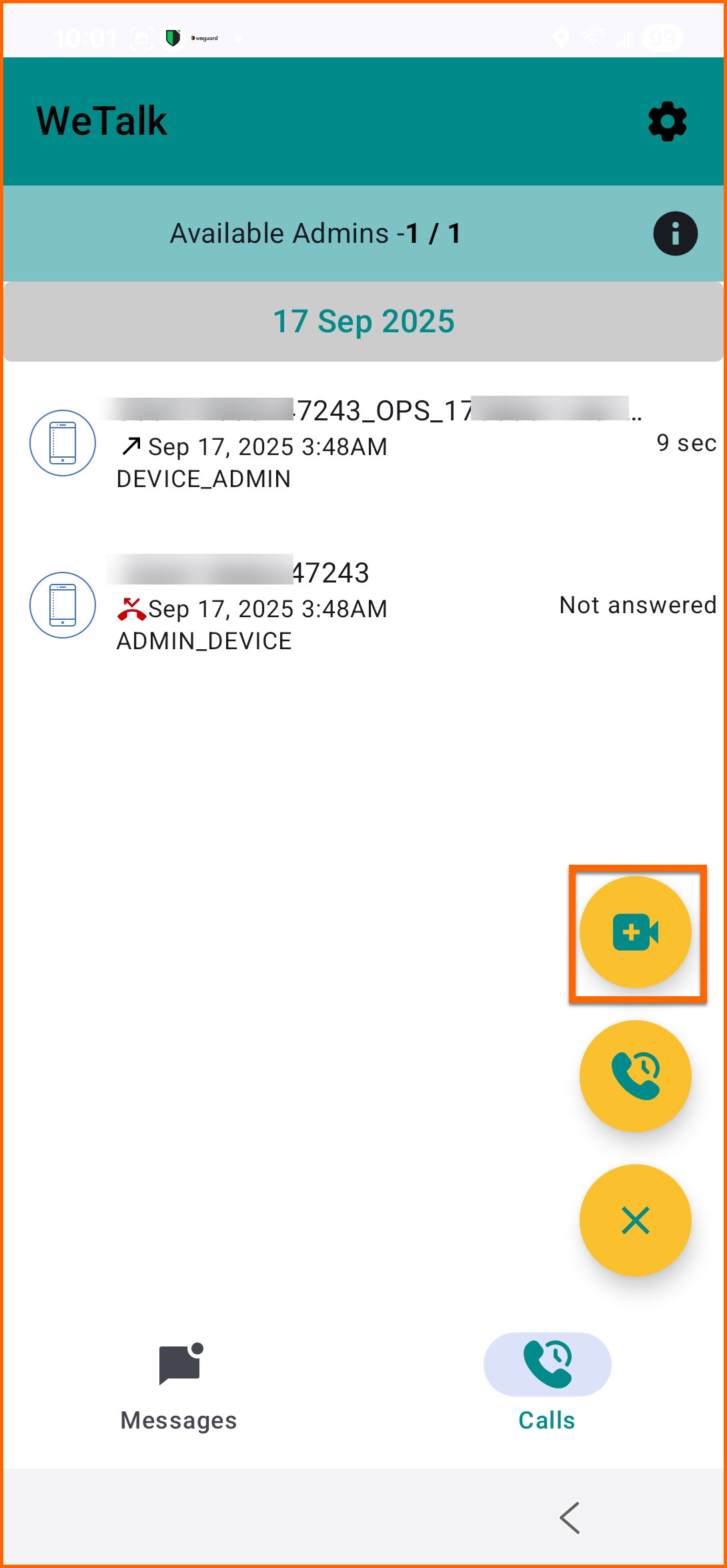 - Alternatively, tap the yellow button Video or Audio Icon at the bottom to call all available admins.