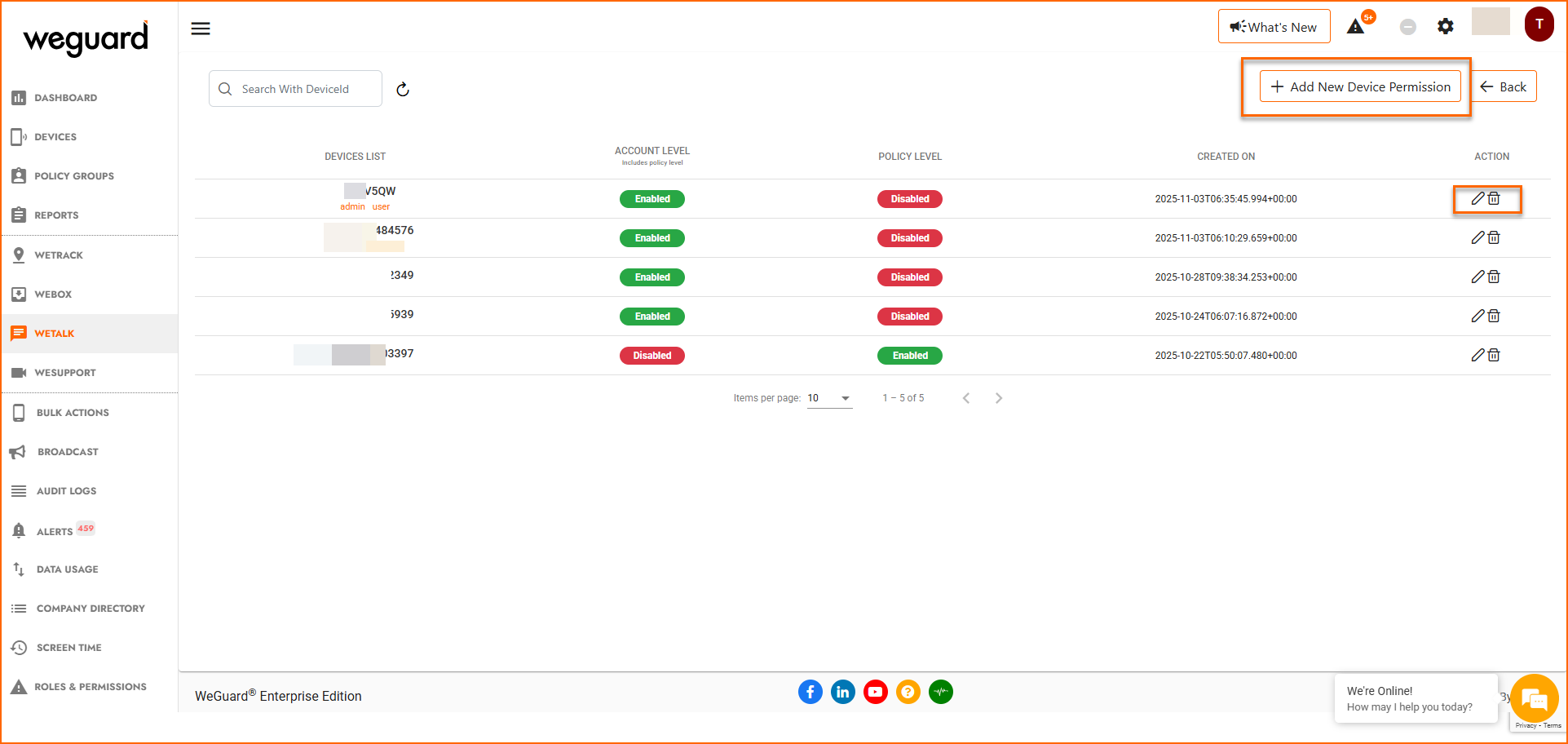 - Click on the Pencil button to edit the permissions or the Trashcan button to delete the existing device permission.